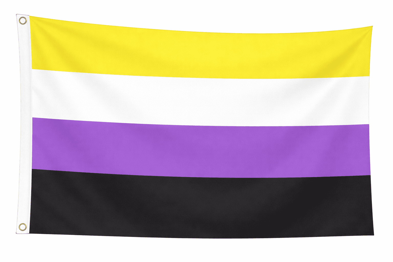 De non-binaire identiteit valt buiten de traditionele verdeling van man en vrouw. Deze vlag met geel, wit, paars en zwart symboliseert mensen die zich niet uitsluitend identificeren als man of vrouw.